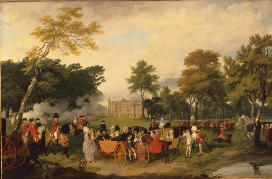 We cannot say for certain what the house looked like since paintings in which it features by William Ashford (from which the engraving at the top of this piece is taken) and Francis Wheatley (see the very last picture, showing the second Earl reviewing the Aldborough Volunteers at Belan) display differences that suggest to some extent they reflected the owner’s aspirations for the building rather than its actual appearance. Nevertheless we do know the main block, large and plain, was 120 feet long and 44 feet deep, of three storeys with a gabled attic and projecting end bays. To its right were the pair of parallel stable blocks that still survive (albeit in ruinous state), the first of them linked to the house by a curved portico.